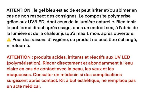 Attention : produits irritants et réactifs aux UV LED (polymérisation). Rincer directement à l’eau claire en cas de contact avec la peau, les yeux et les muqueuses. Consulter un médecin si complications après contact.